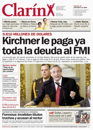 - La verdadera tapa del diario, publicada el 16 de diciembre de 2005, señala: “Kirchner le paga ya toda la deuda al FMI”.
