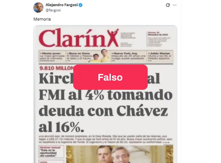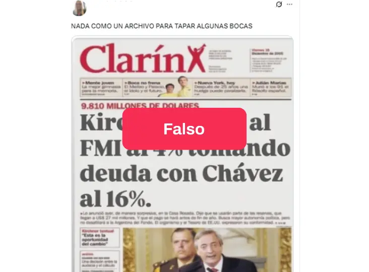 Los mensajes, publicados en X , muestran una tapa del diario Clarín cuyo título principal afirma (con una tipología de letra diferente a la que tradicionalmente utiliza el diario): “Kirchner paga al FMI al 4% tomando deuda con Chávez al 16%”.