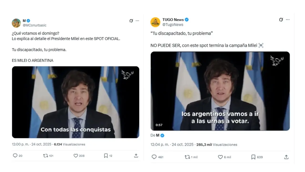 A 2 días de las elecciones legislativas, circula en redes sociales un presunto spot de campaña de La Libertad Avanza donde el presidente Javier Milei supuestamente dice: “En unos días los argentinos vamos a ir a las urnas a votar. Tenemos que decidir si queremos un país con más o con menos Esperts (….) Tenemos que decidir si queremos que se siga tirando la plata de nuestros impuestos y jubilaciones altísimas en dólares, y en asistencia para discapacitados que no son ni nuestros hijos ni nietos. Tu discapacitado, tu problema”.