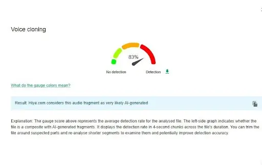 Un análisis del audio de los fragmentos agregados, realizado por AFP Factual con la herramienta Hiya, de InVID-WeVerify, arrojó un 83% de probabilidades de haber sido creado con IA.