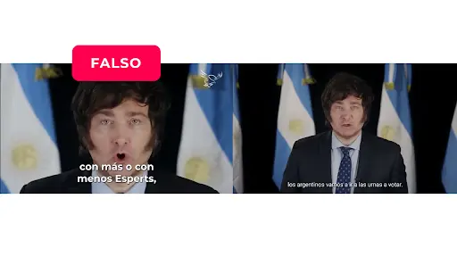 Además, en los fragmentos creados con IA, los movimientos de la figura de Milei son bruscos y repetitivos, pero en los verdaderos el presidente no se mueve de esa manera.