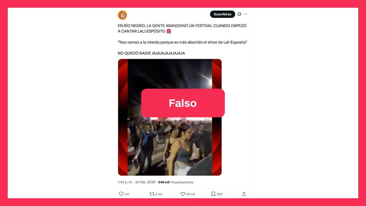 Circula en redes sociales un video que supuestamente muestra a personas abandonando el predio de un festival mientras cantaba Lali Espósito. Las imágenes fueron grabadas el último 22 de febrero durante la Fiesta Nacional de la Manzana 2026, que se celebró en General Roca, Río Negro.