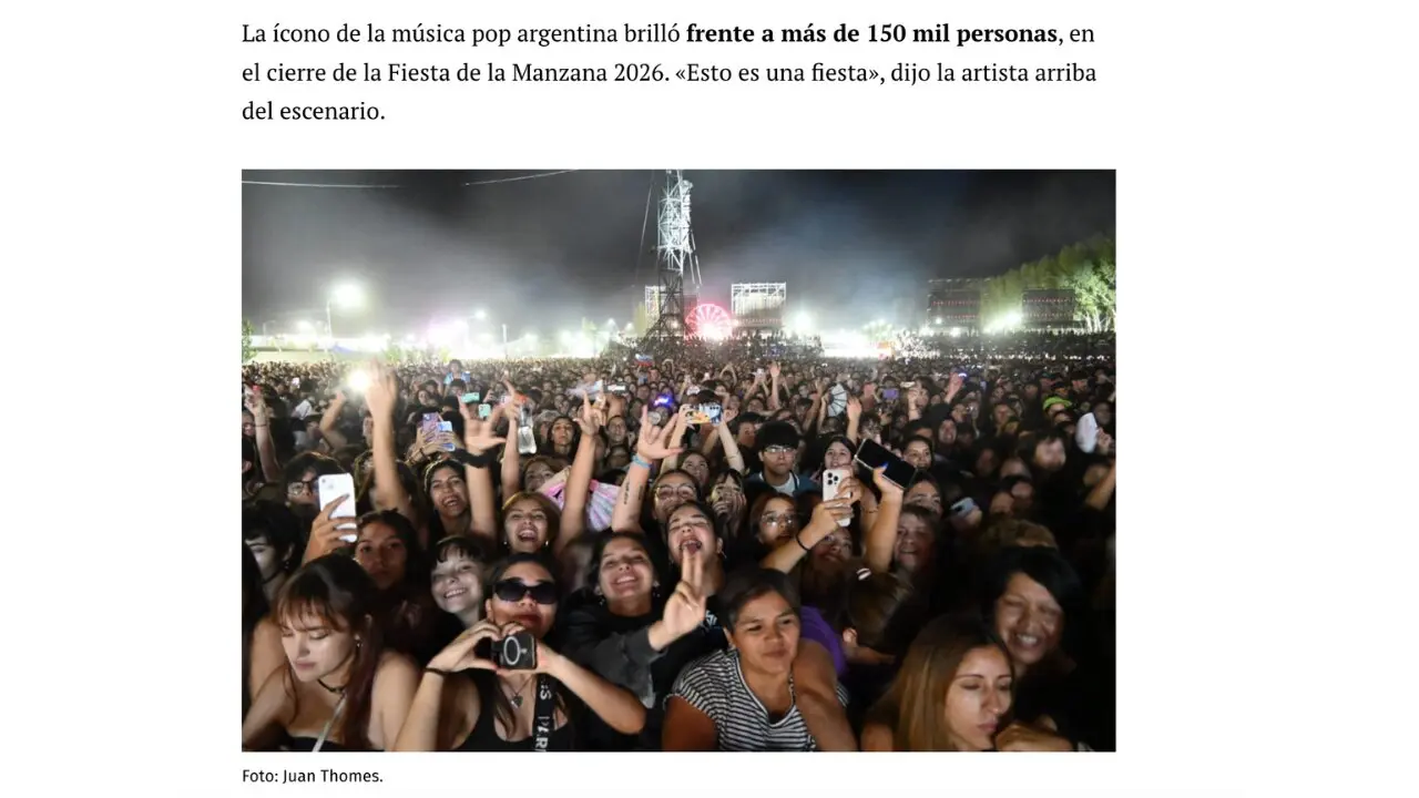 El Diario Río Negro, que cubrió en vivo los 3 días del festival, compartió en esta fotogalería imágenes del show que muestran a cientas de personas en el predio. En otra nota, el medio detalló: “Lali subió al escenario mayor y le dio cierre a la Fiesta de la Manzana 2026 en Roca. Frente a una marea que superó las 150 mil personas, la estrella del pop coronó el festejo manzanero”.