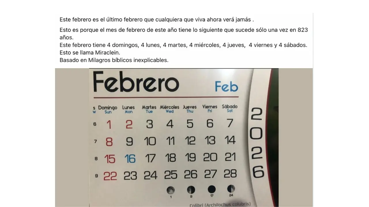 El mensaje viral dice: “El próximo febrero es el último febrero que cualquiera que viva ahora verá jamás. Eso es porque el mes de febrero de este año tiene lo siguiente que sucede solo una vez en 823 años. Este febrero tiene: 4 domingos 4 lunes 4 martes 4 miércoles 4 jueves 4 viernes 4 sábados”.