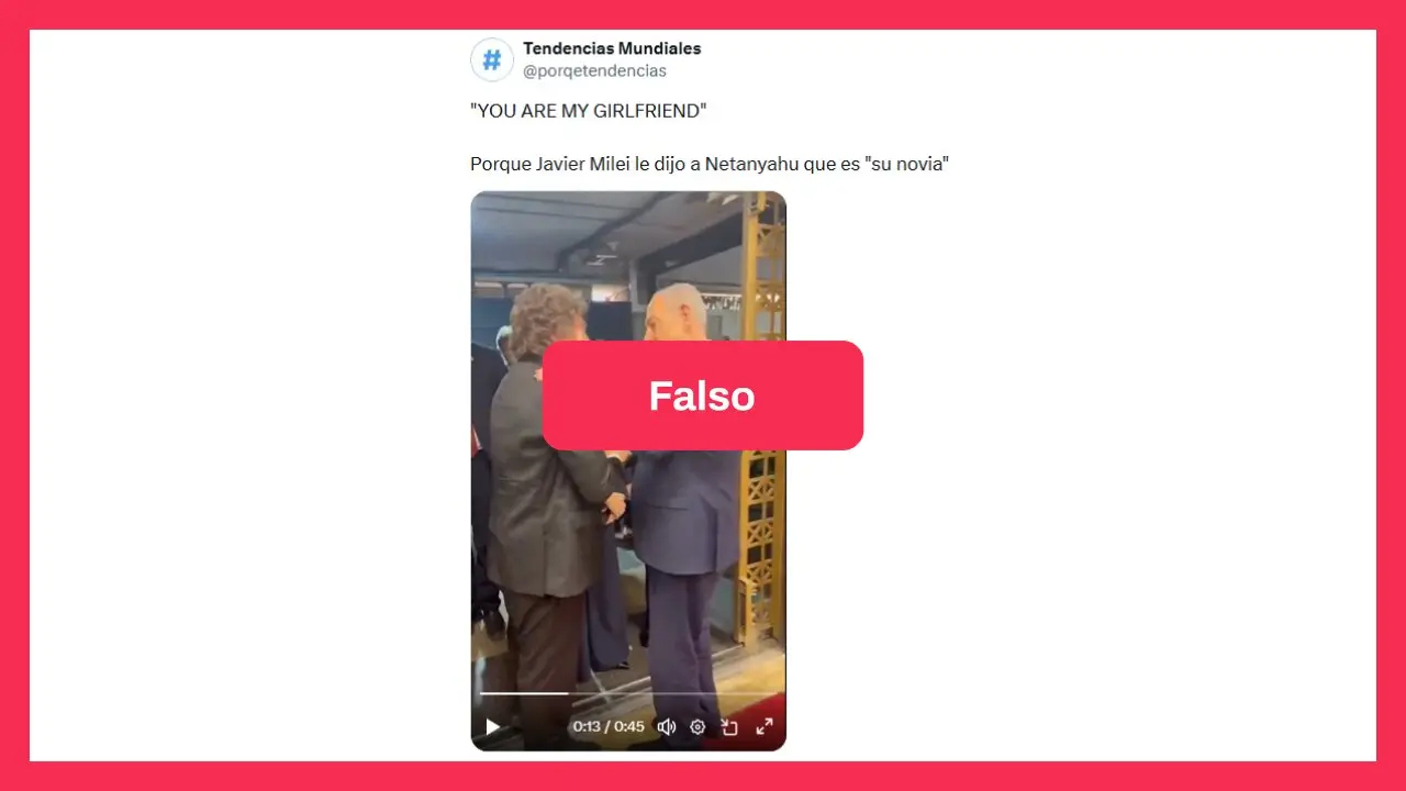 En este contexto, se viralizó una publicación compartida por la cuenta de X “Tendencias Mundiales” que asegura que, en el video, Milei llamó a su par israelí “my girlfriend” (“su novia”, en inglés) al saludarlo.