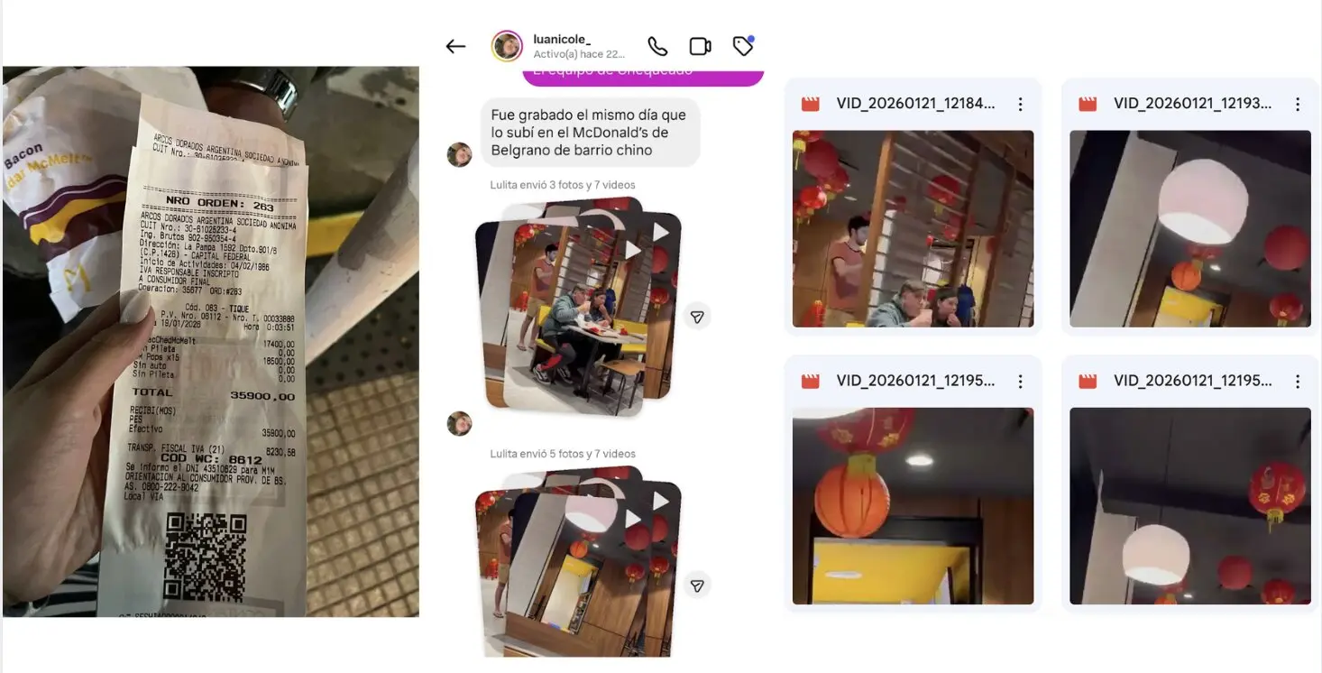 Además, este medio se comunicó con la usuaria @luanicole_, quien filmó y subió el video en su cuenta de TikTok. Y quien compartió a Chequeado otros videos del hecho y un registro fotográfico de que el 19 de enero consumió en el McDonald’s del Barrio Chino.