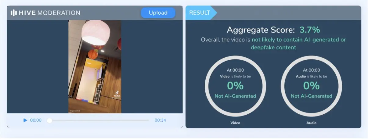 Las herramientas Hive Moderation e InVid-WeVerify, que identifican si ciertos contenidos fueron generados con IA, no arrojaron probabilidades de que el video haya sido generado con esta tecnología.