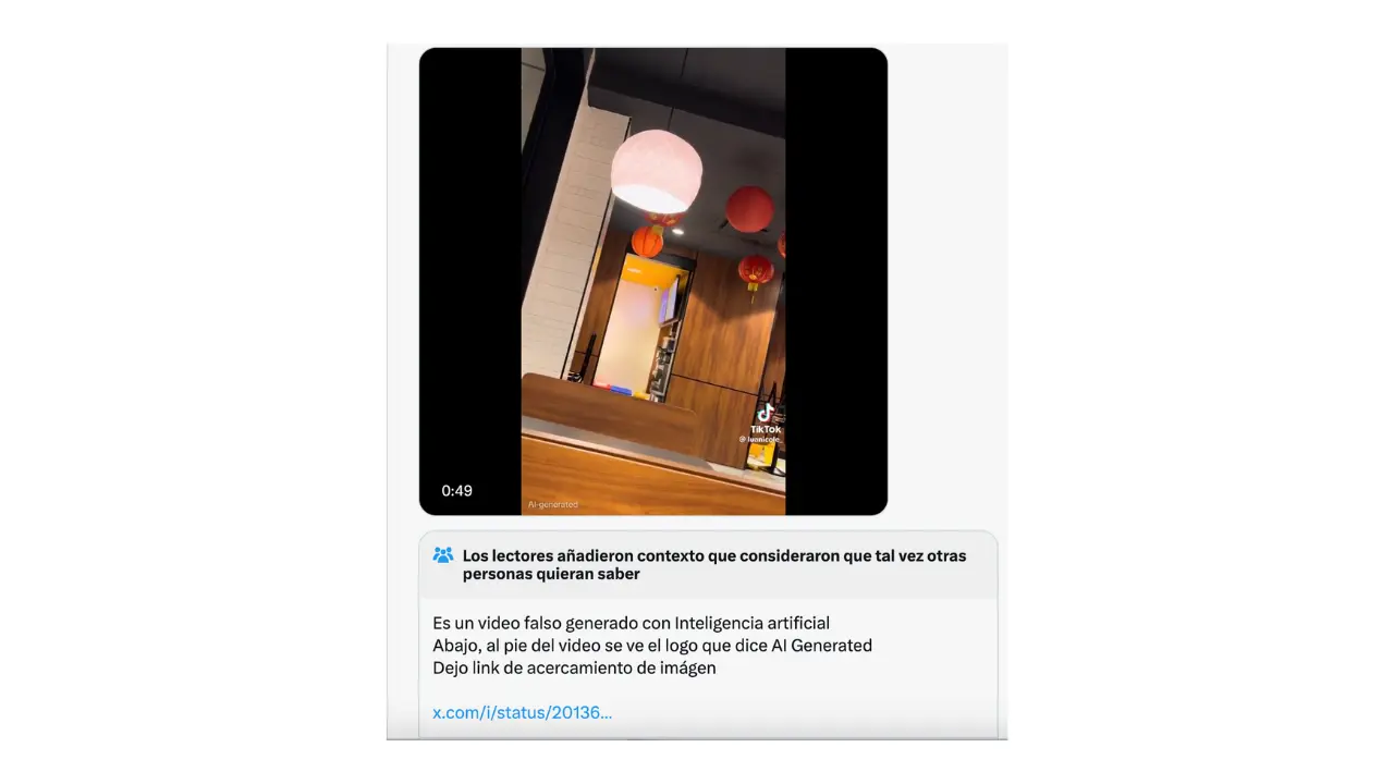 En los posteos de X, en los comentarios de los usuarios, se sostiene que el video viral es falso y que fue generado con inteligencia artificial. “Abajo, al pie del video se ve el logo que dice AI Generated. Dejo link de acercamiento de imágen”, dice un posteo.