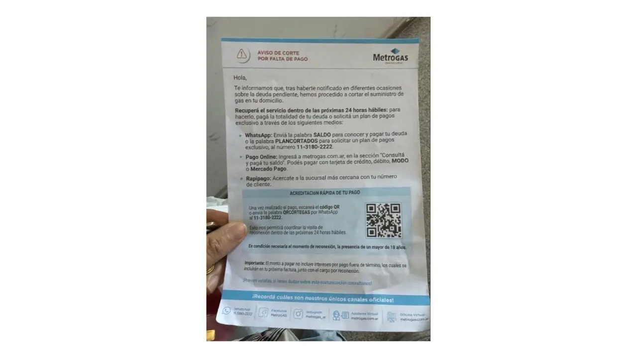 Este aviso de corte de servicio de Metrogas no es una estafa: es verdadero y el QR remite a su línea de WhatsApp verificada