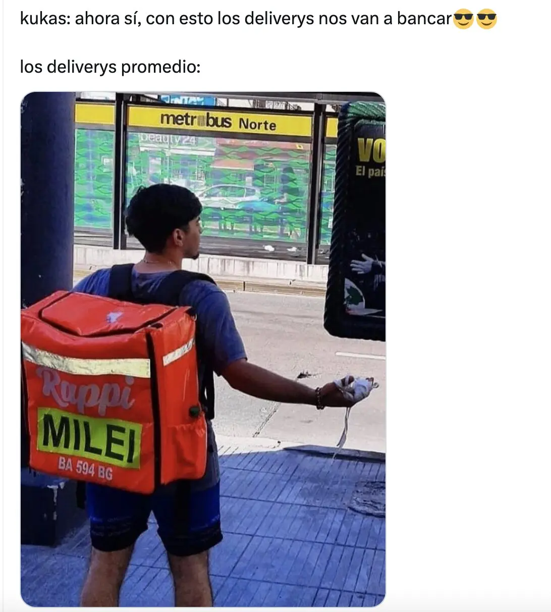 Circula como si fuera actual, una foto de un repartidor de Rappi apoyando al presidente de la Nación, Javier Milei. “La clase laburante BANCA a Milei y ODIA a los Kukas”, “kukas: ahora sí, con esto los deliverys nos van a bancar. los deliverys promedio:”, dicen los posteos virales.