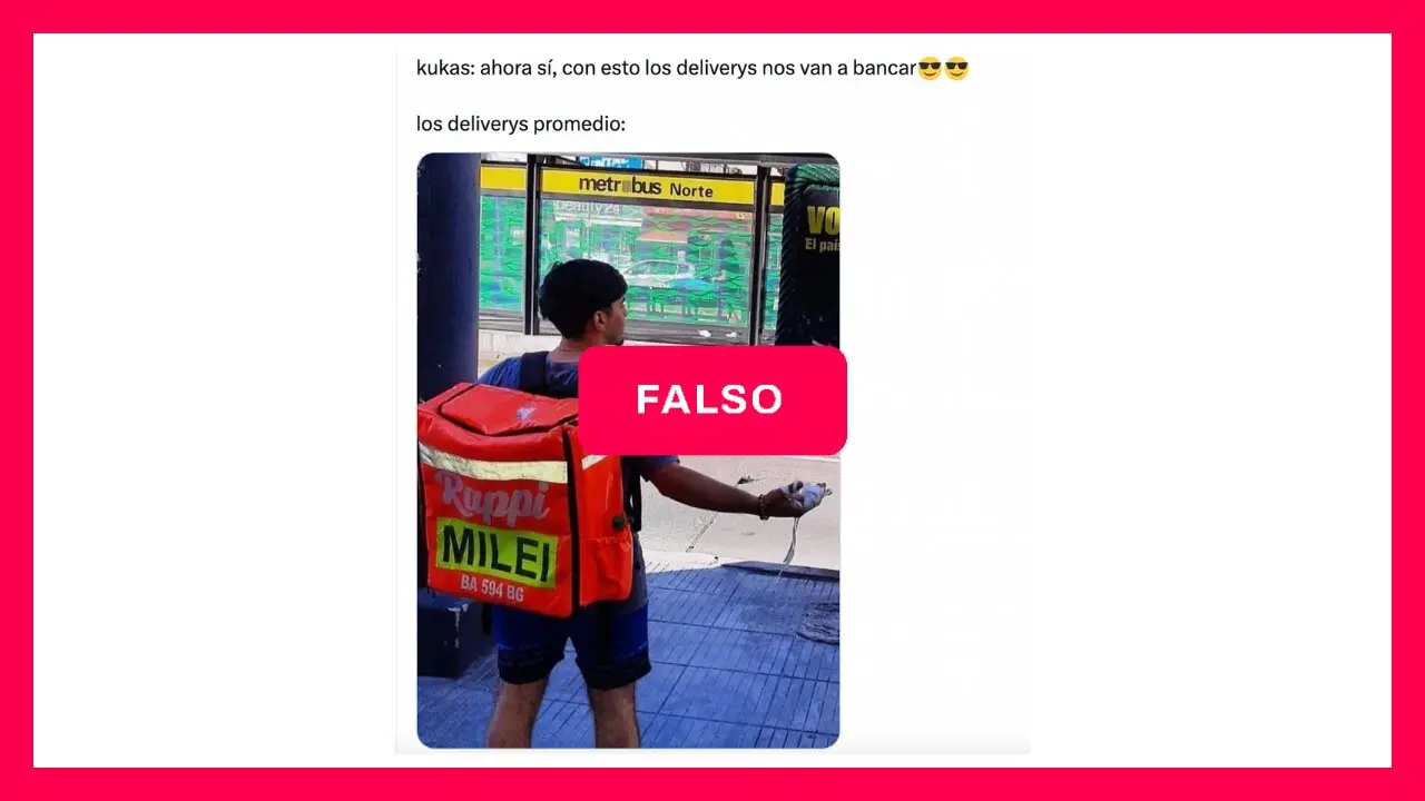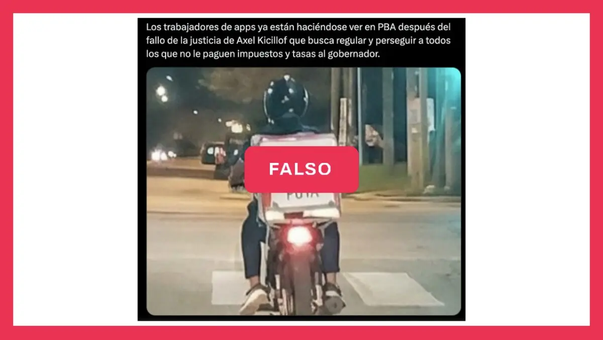 Sin embargo, la foto no es actual y no está relacionada con la sentencia de la Justicia bonaerense. Esta foto circula desde, al menos, 2023, y, según señalan noticias de aquel año, se la tomaron a un repartidor como parte de la campaña de La Libertad Avanza, que convocaban a “pibes Rappi” para votar a Milei.