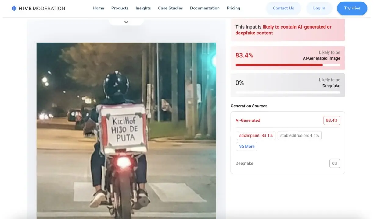 La herramienta Hive Moderation arrojó que la foto tienen un 83,4% de probabilidades de haber sido generada con esta tecnología.