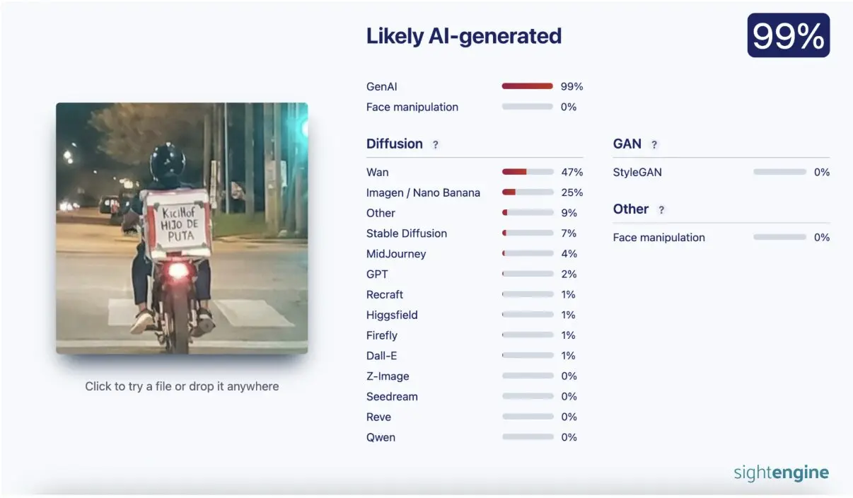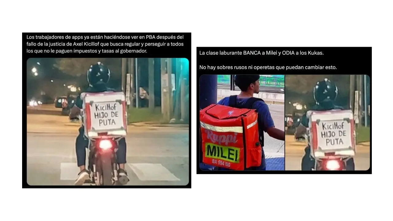 - A raíz de esto, circuló en redes sociales una foto de un repartidor de una app en moto en cuya caja de envío aparece un insulto hacia el gobernador bonaerense, Axel Kicillof. Sin embargo, la foto no es real, fue generada con IA.