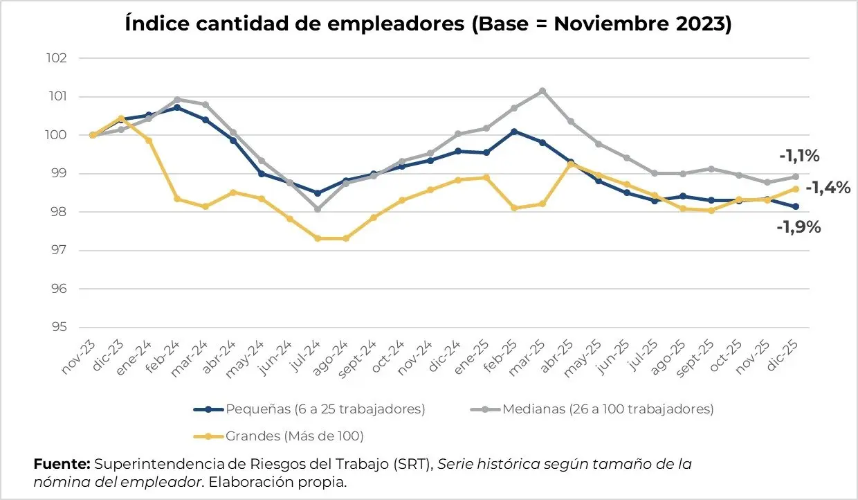 - De acuerdo con los datos oficiales de la Superintendencia de Riesgos de Trabajo (SRT), el número de empresas registradas cayó 4,4% entre noviembre de 2023 (último mes de la gestión del Frente de Todos) y diciembre de 2025 (último dato disponible).