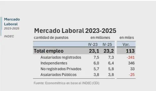 Para respaldar sus dichos, el Presidente compartió un gráfico de la consultora Econométrica (que dirige el economista Ramiro Castiñeira), en el que se muestra -en base a datos del INDEC- que entre el cuarto trimestre de 2023 e igual período de 2025 la cantidad de puestos de trabajo aumentó gracias a la creación de trabajadores por cuenta propia (independientes), mientras que el empleo registrado cayó.