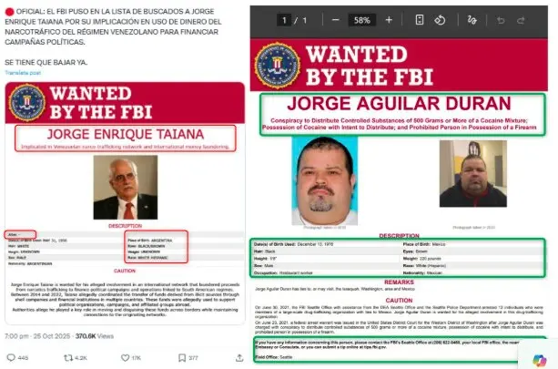 “Oficial: El FBI puso en la lista de buscados a Jorge Enrique Taiana por su implicación en uso de dinero del narcotráfico del régimen venezolano para financiar campañas políticas. Se tiene que bajar ya”, se lee en publicaciones en Threads e Instagram, X y Facebook junto al supuesto aviso de la agencia federal estadounidense.