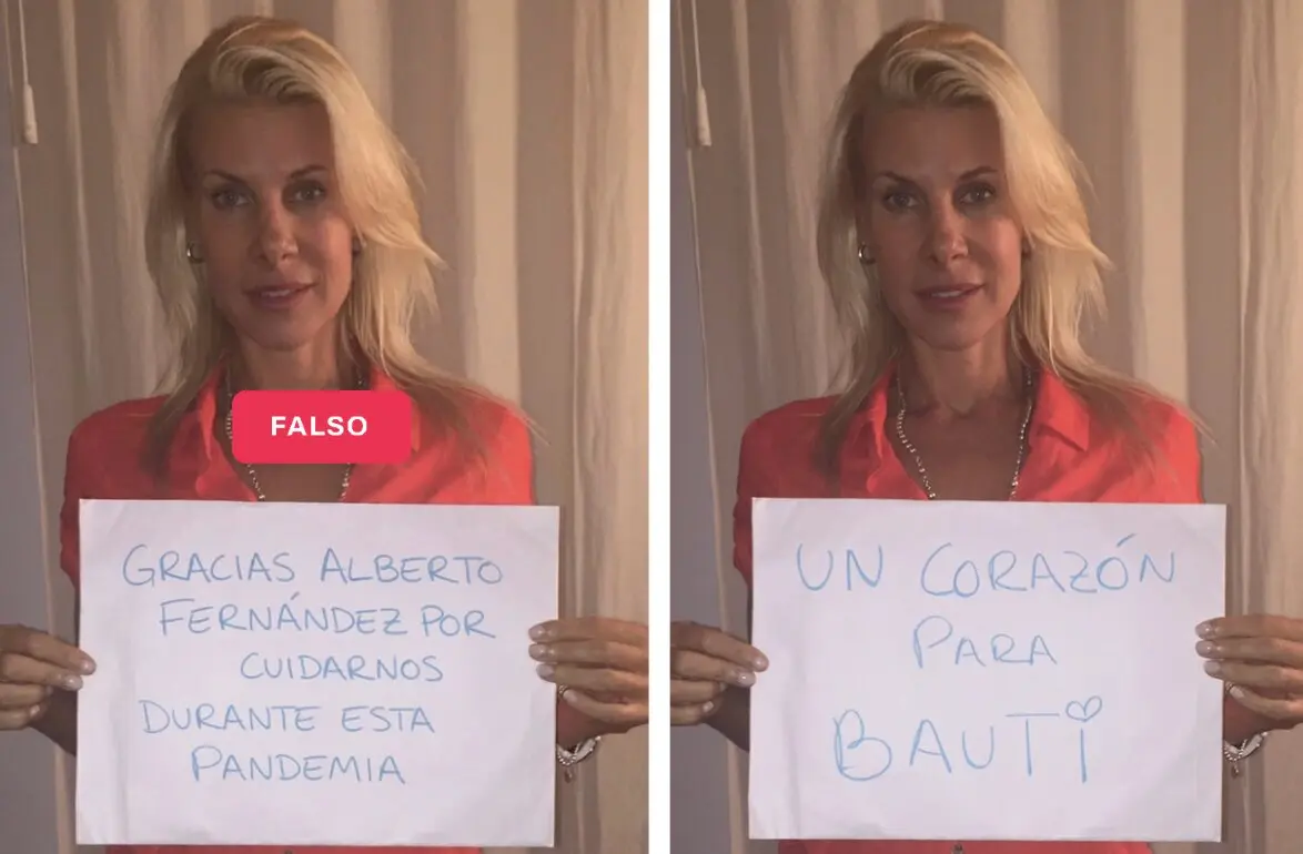 • También circula una supuesta foto de Reichardt con un cartel que dice: “Gracias Alberto Fernández por cuidarnos durante esta pandemia”. Sin embargo, esto es falso. La imagen viral está editada y la foto original fue publicada por Reichardt en marzo de 2016. Allí posa con un cartel que dice: “Un corazón para Bauti”.