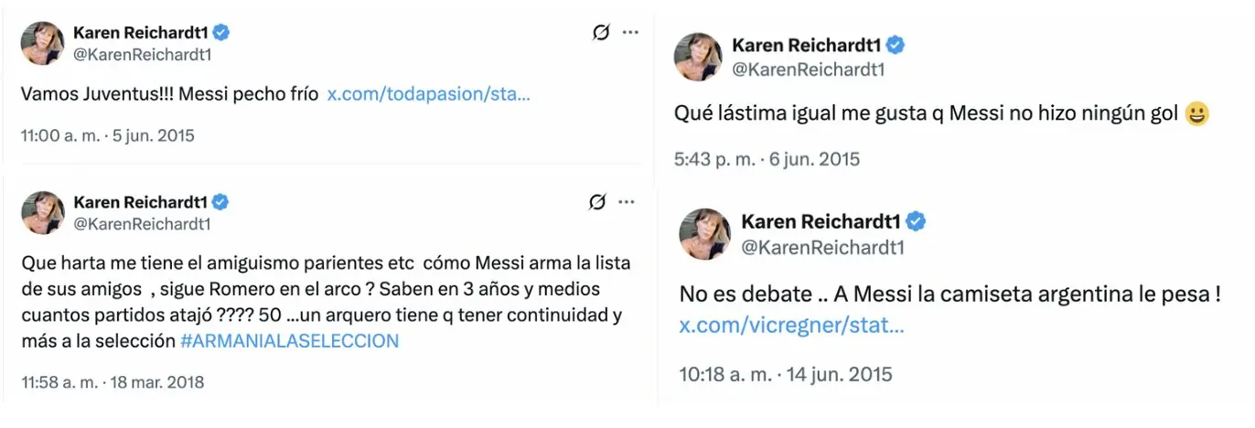 Esto es verdadero. Chequeado confirmó que están publicados en su cuenta oficial de X, @KarenReichardt1 (ver acá, acá, acá y acá). Los posteos de la candidata de La Libertad Avanza fueron publicados entre 2015 y 2018, luego de que Messi perdiera tres finales con la Selección argentina y antes de que saliera bicampeón de la Copa América en 2021 y 2024, y campeón del Mundial de Catar en 2022.