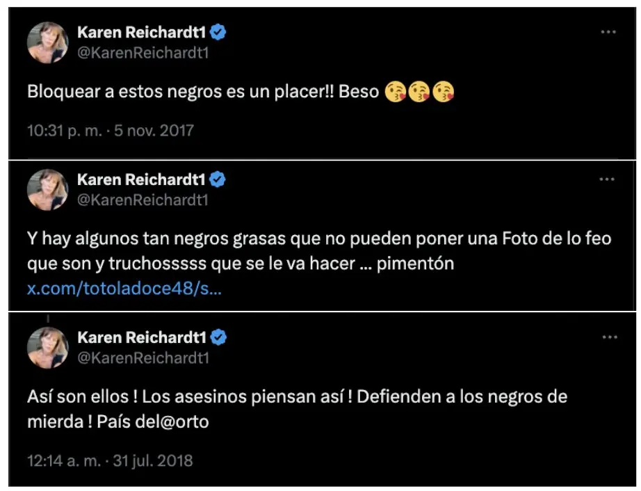 • Circulan varios tuits discriminatorios de Karen Reichardt, en los que habla de “negros” y “villeros”. Esto es verdadero. Los tuits fueron publicados entre 2017 y 2018 en su cuenta de X. Están dedicados a los votantes del kirchnerismo y a los hinchas de Boca.