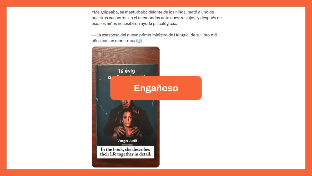 - Esto es engañoso. No existe ningún libro escrito por Varga sobre su matrimonio con Magyar y tampoco hay registros de las supuestas declaraciones. Sin embargo, sí es cierto que lo acusó por violencia de género en 2024, según reportes de medios locales e internacionales.