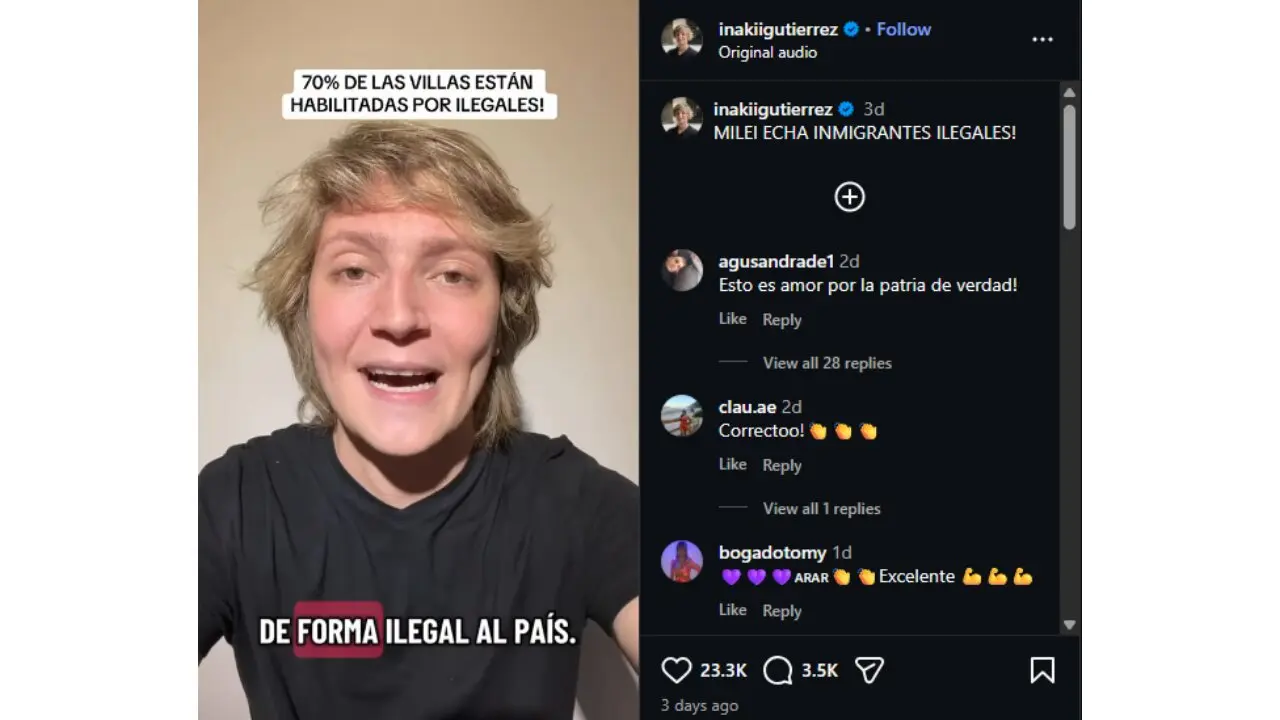 - El influencer de La Libertad Avanza Iñaki Gutiérrez dijo en un posteo viral que “el 70% de los habitantes de las villas argentinas son extranjeros que entraron de forma ilegal” y pidió su expulsión inmediata.