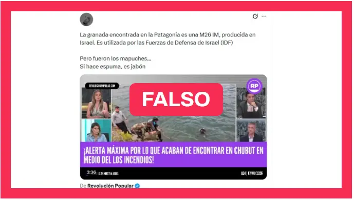 Circulan en redes posteos que aseguran que se encontró en la Patagonia una granada M26 producida por Israel, en el marco de los incendios en Chubut. Algunas de las publicaciones fueron difundidas por la cuenta de X “Sanmartiniano” (@Ley_SanMartin).