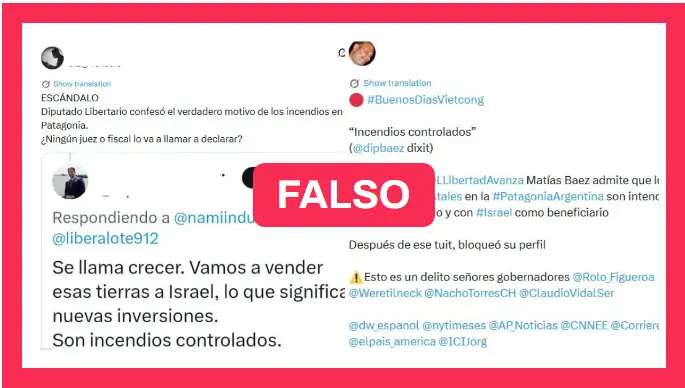 Circulan en redes posteos que aseguran que un supuesto diputado de La Libertad Avanza llamado Matías Baez confesó que los incendios en la Patagonia son intencionales para “vender esas tierras a Israel”. Algunas de las publicaciones fueron difundidas por el economista Carlos Riello y la cuenta de X “El Prensero”.