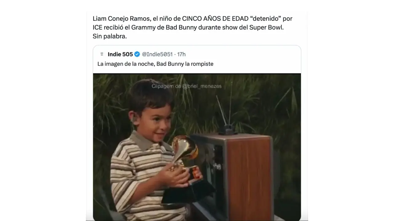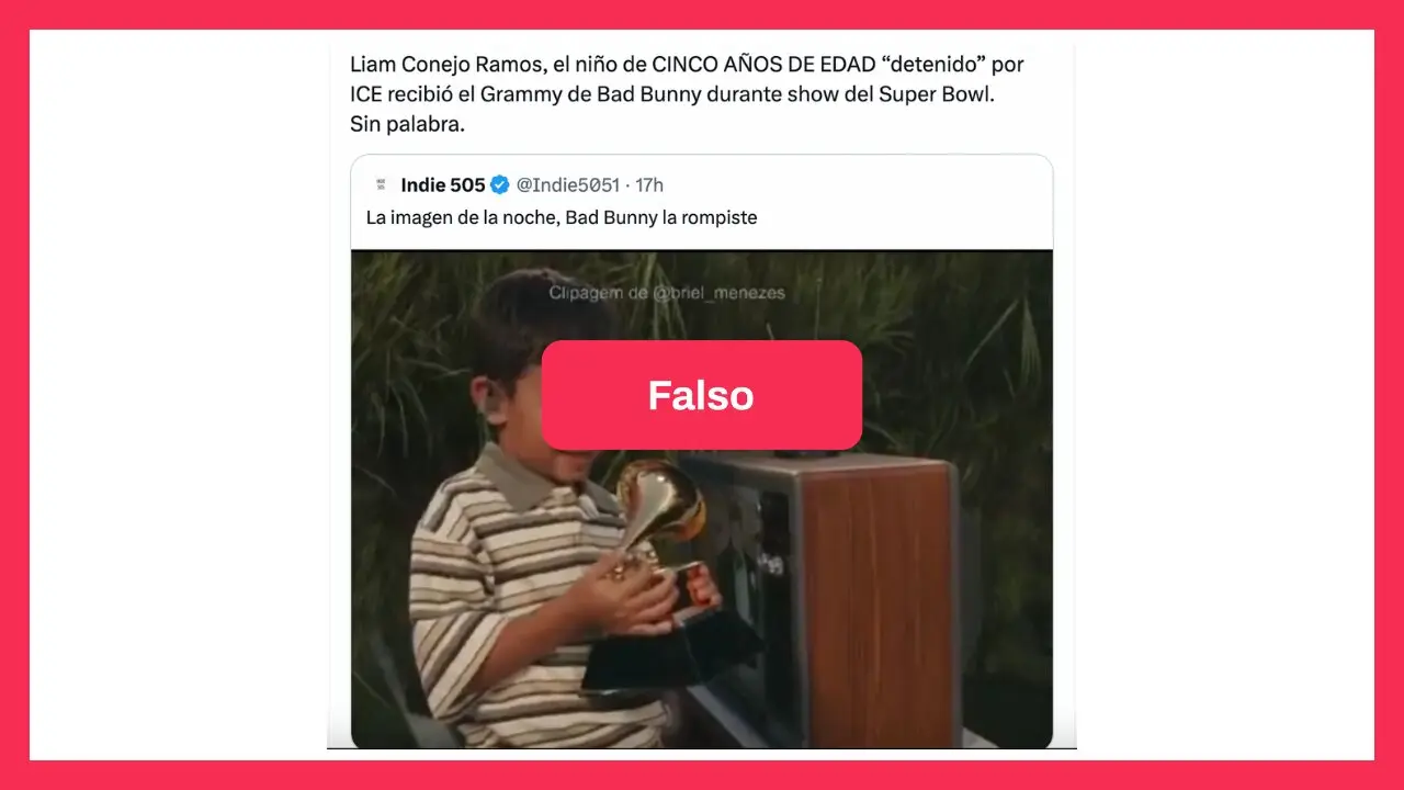 - Circulan en redes sociales imágenes del show de medio tiempo del Super Bowl 2026 que afirman que Bad Bunny le entregó su premio Grammy a Liam Conejo Ramos, un niño ecuatoriano detenido y luego liberado por ICE en Mineápolis.