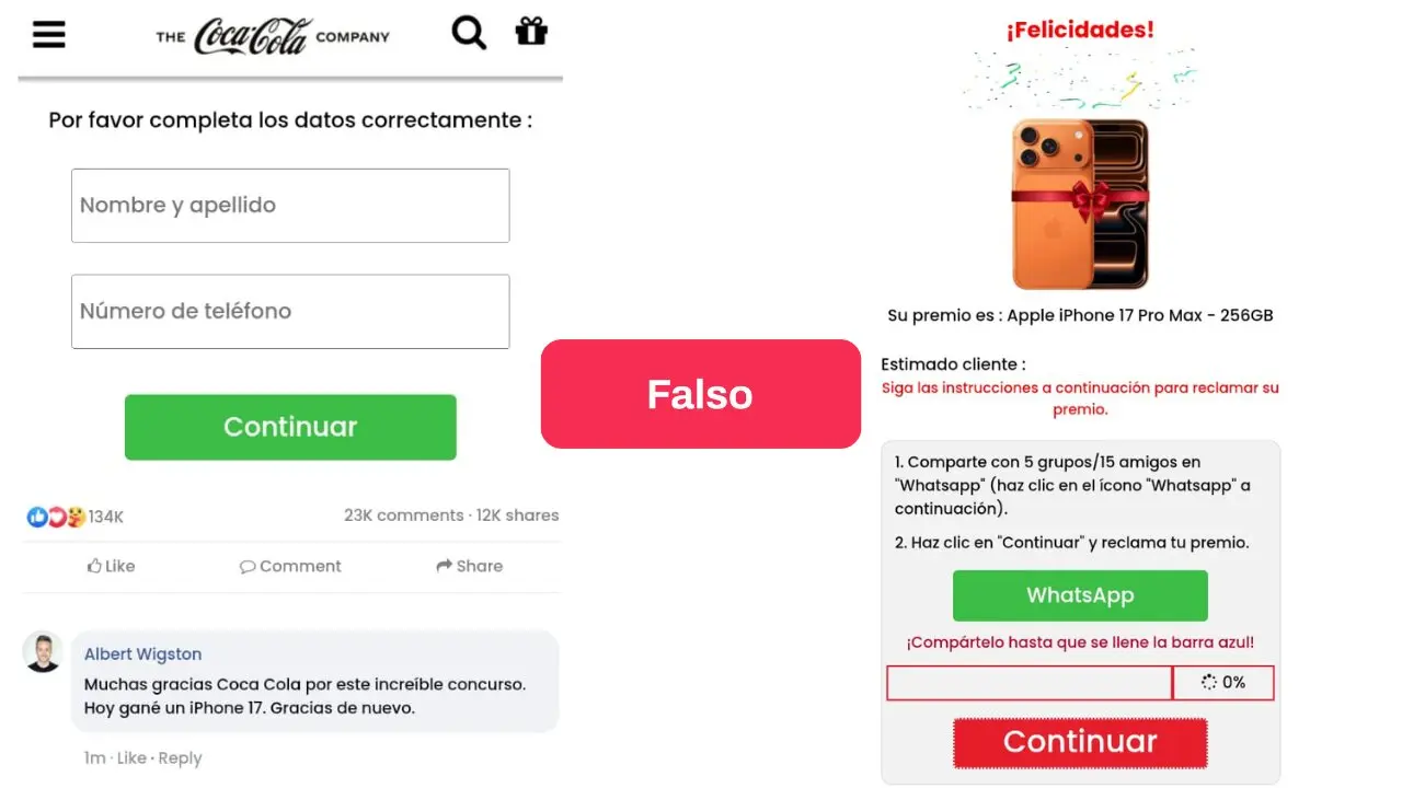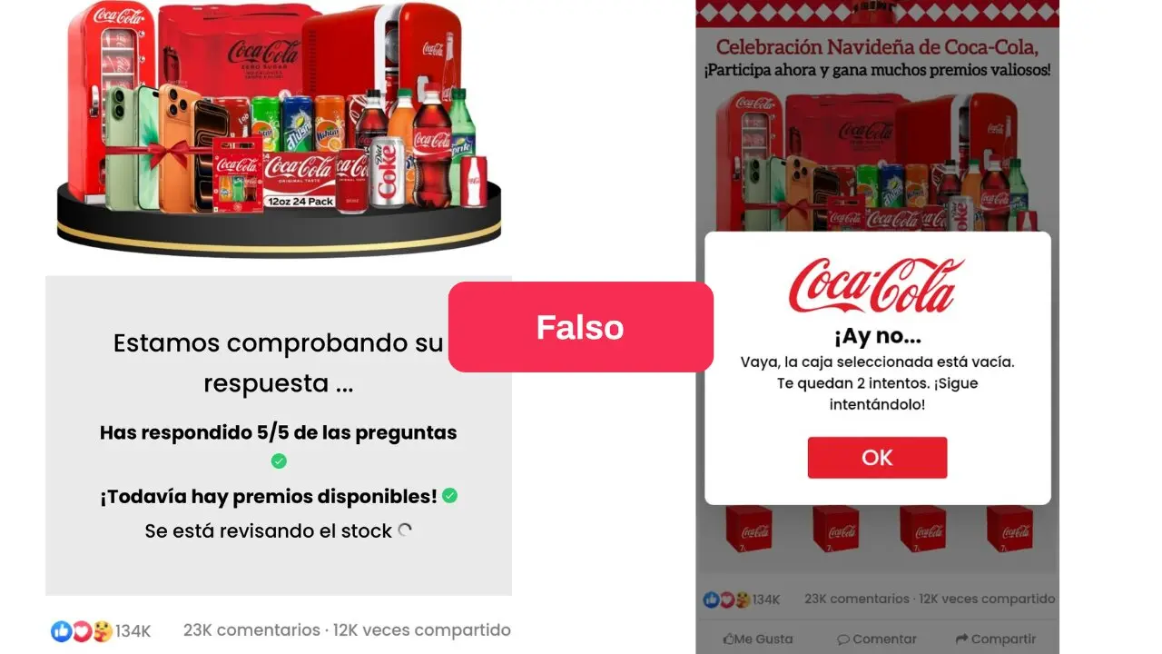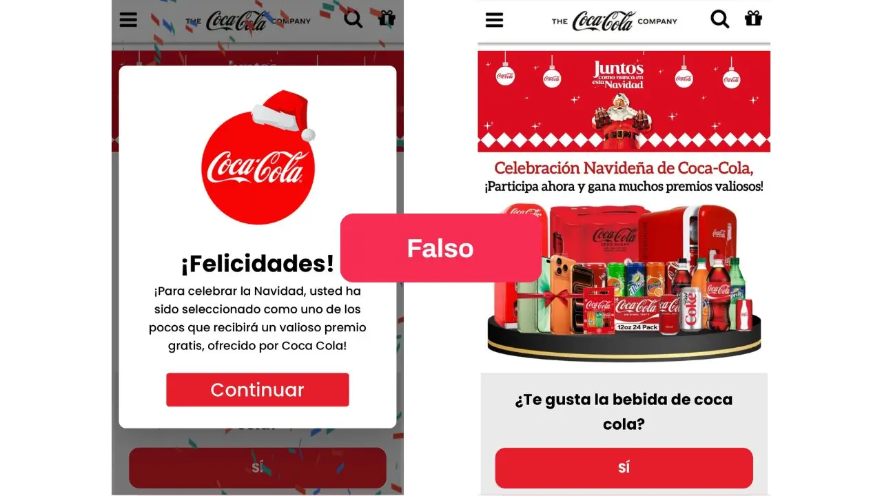 - Circula por WhatsApp y redes sociales un enlace a un supuesto sitio de Coca-Cola que promete premios navideños gratuitos a cambio de responder un cuestionario, compartir el sorteo con otros usuarios e ingresar datos personales. Pero es una estafa.