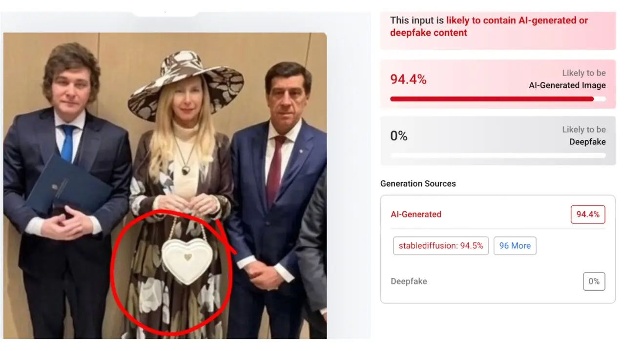 - Sin embargo, esto es falso. La foto fue editada con IA, según herramientas especializadas. En la foto original Karina Milei no tiene esa vestimenta.