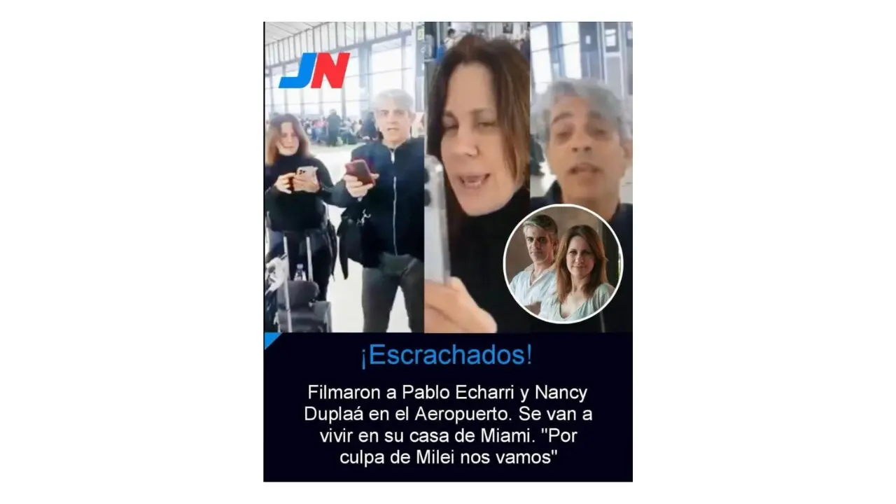 - Circula en redes sociales una supuesta placa con fotos de los actores Pablo Echarri y Nancy Dupláa en Ezeiza que asegura que ambos se irán a vivir a Miami tras el triunfo de La Libertad Avanza en las elecciones legislativas 2025.