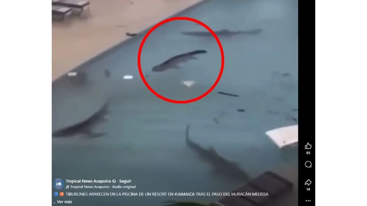 - Circula en redes sociales un video que supuestamente muestra tiburones nadando en la pileta de un hotel en Jamaica tras el paso del huracán Melissa, que azotó ese país, además de Cuba, Haití y República Dominicana, a finales de octubre de 2025.
