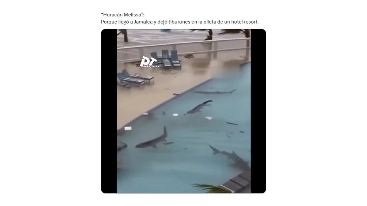 - Circula en redes sociales un video que supuestamente muestra tiburones nadando en la pileta de un hotel en Jamaica tras el paso del huracán Melissa, que azotó ese país, además de Cuba, Haití y República Dominicana, a finales de octubre de 2025.