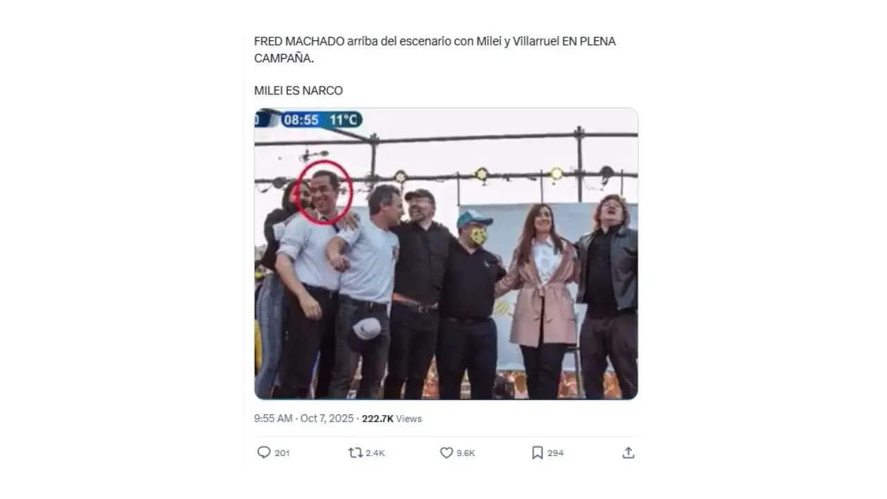 Circulan en redes sociales publicaciones que muestran una foto de 7 personas sobre un escenario, acompañada del siguiente mensaje: “FRED MACHADO arriba del escenario con Milei y Villarruel EN PLENA CAMPAÑA. MILEI ES NARCO”.