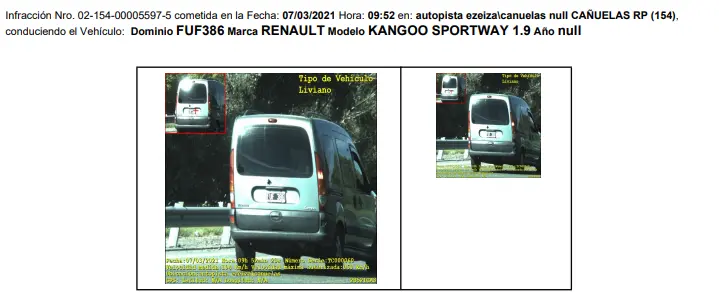 Una de esas multas, de 2021, contiene una imagen del vehículo que tiene esa patente. El vehículo no es un Ford Falcon, sino una Renault Kangoo Sportway. La otra multa, de 2024, también contiene una imagen donde se ve el mismo auto