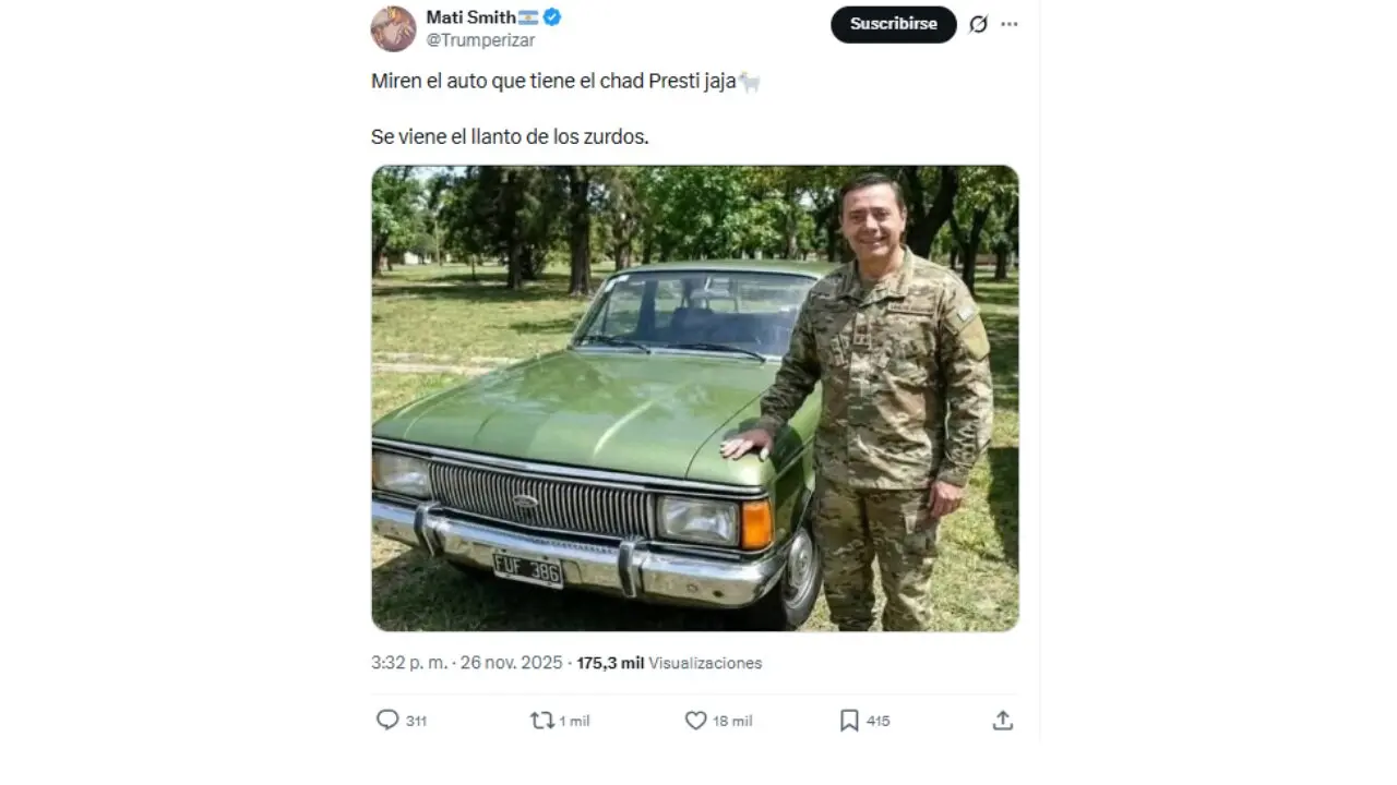 La imagen circuló en X y Facebook, alcanzando más de 250 mil visualizaciones y 24 mil reacciones. “Miren el auto que tiene el chad Presti jaja Se viene el llanto de los zurdos”, dice el tuit.
