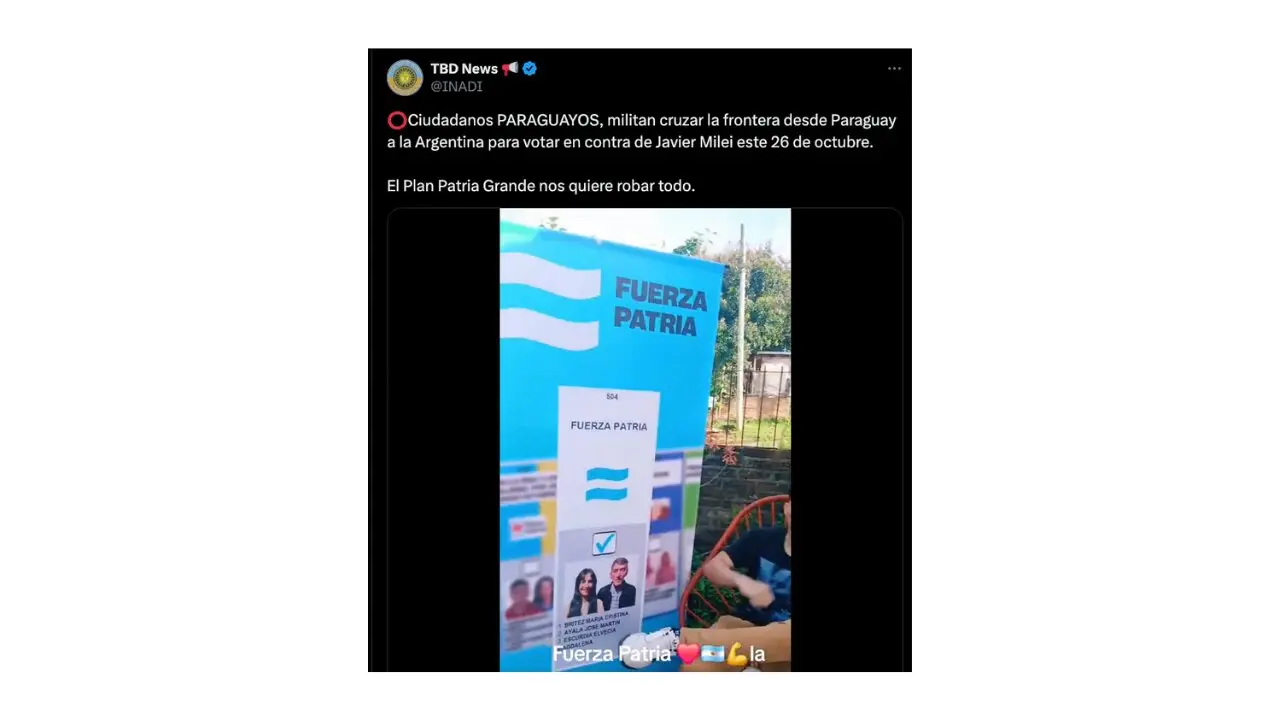 - En este contexto, circulan en redes sociales posteos que afirman que “Ciudadanos paraguayos, militan cruzar la frontera desde Paraguay a la Argentina para votar en contra de Javier Milei este 26 de octubre” (sic).