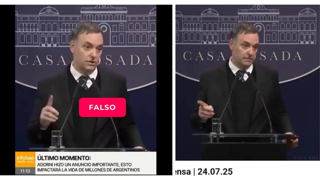 El video usa un fragmento alterado por IA de una conferencia oficial de Adorni