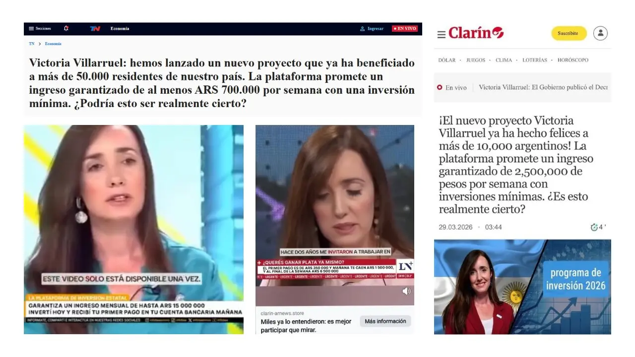 Al clickear sobre estas publicaciones, el usuario llega a supuestos artículos publicados en sitios web de medios de comunicación, que incluyen una presunta entrevista donde Villarruel promociona el proyecto e invita a los ciudadanos a invertir.