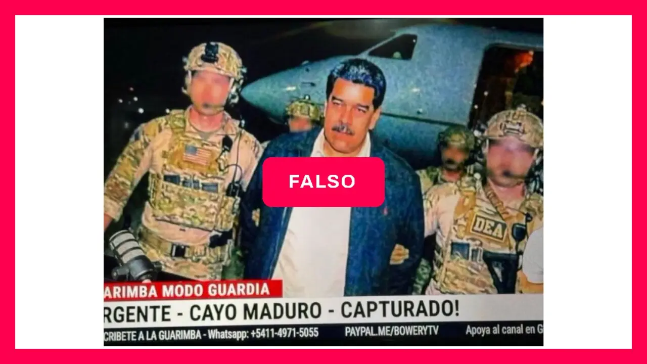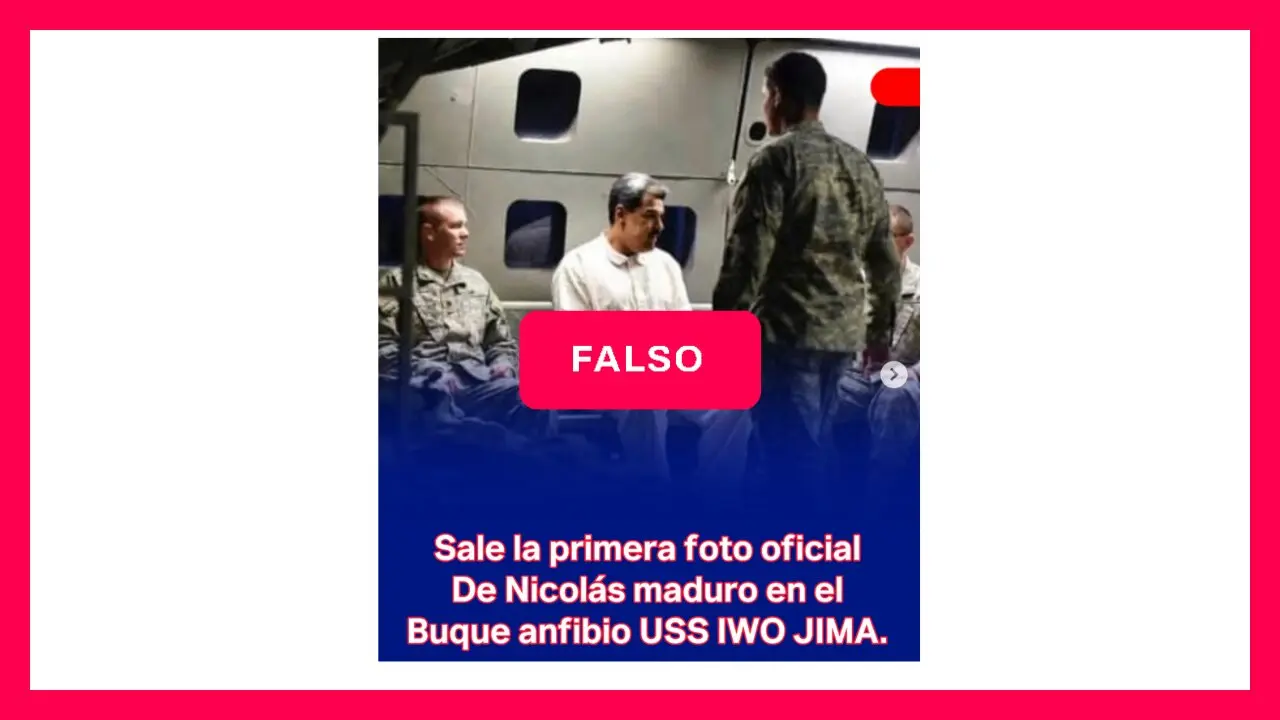 Circuló en redes una imagen de Maduro supuestamente a bordo del USS Iwo Jima con la marca de agua del medio colombiano W Radio. “Esta es la primera foto de Nicolás Maduro tras ser capturado por Estados Unidos”, tituló el medio en su sitio web.
