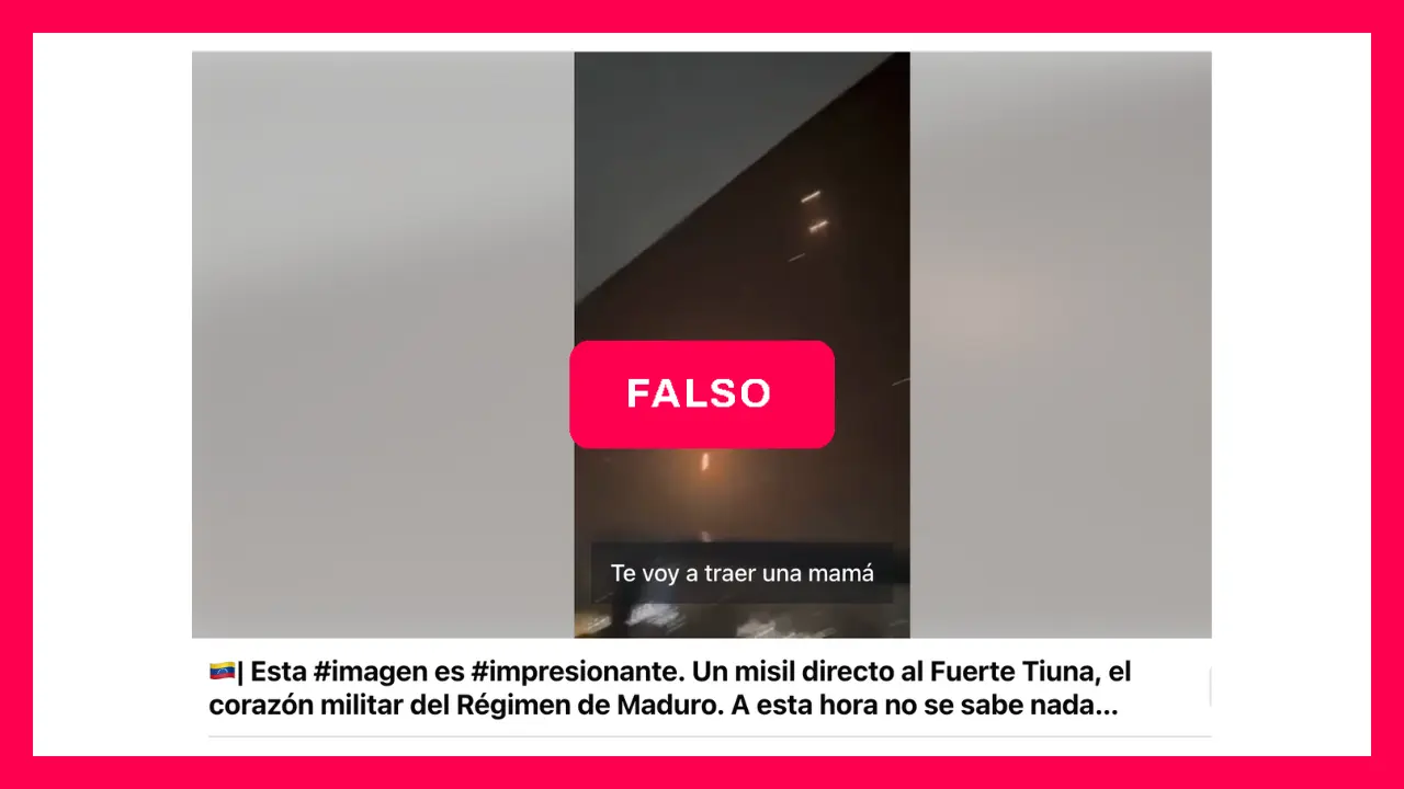 Circula en redes un video que supuestamente muestra el bombardeo al Fuerte Tiuna, ubicado en Caracas, que es el mayor complejo militar de Venezuela. “Un misil directo al Fuerte Tiuna, el corazón militar del Régimen de Maduro”, señala el texto que acompaña al contenido viral.