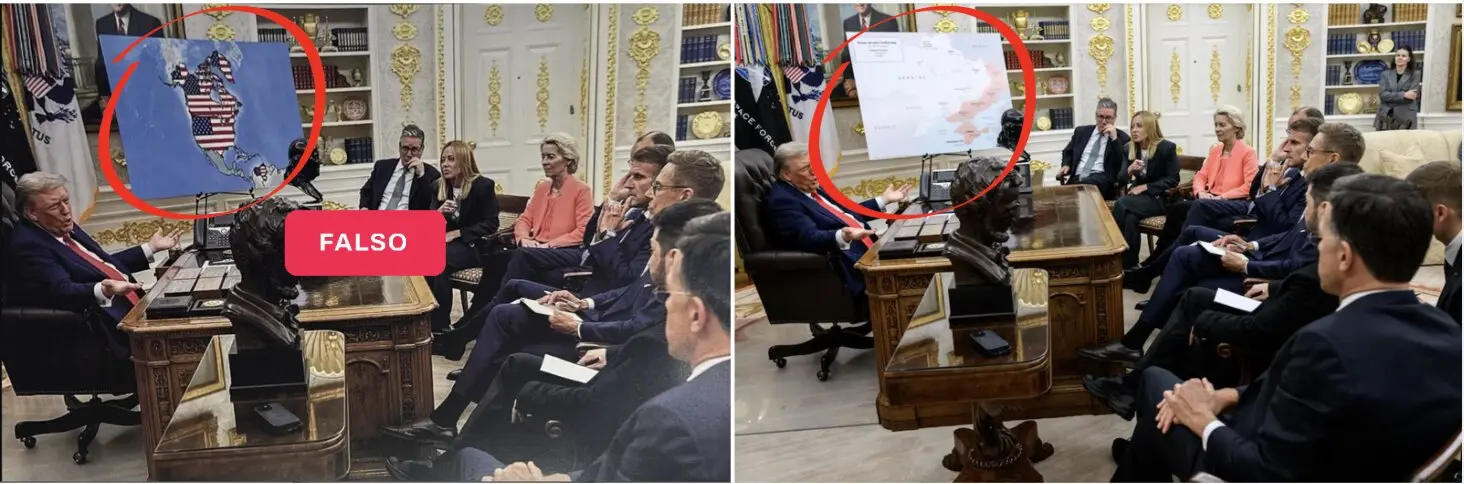 Sin embargo, esta imagen es falsa. La foto original fue tomada el 18 de agosto en el Despacho Oval y fue publicada por la Casa Blanca. El mapa que aparecía en la imagen no era el del continente americano, sino uno de Ucrania.