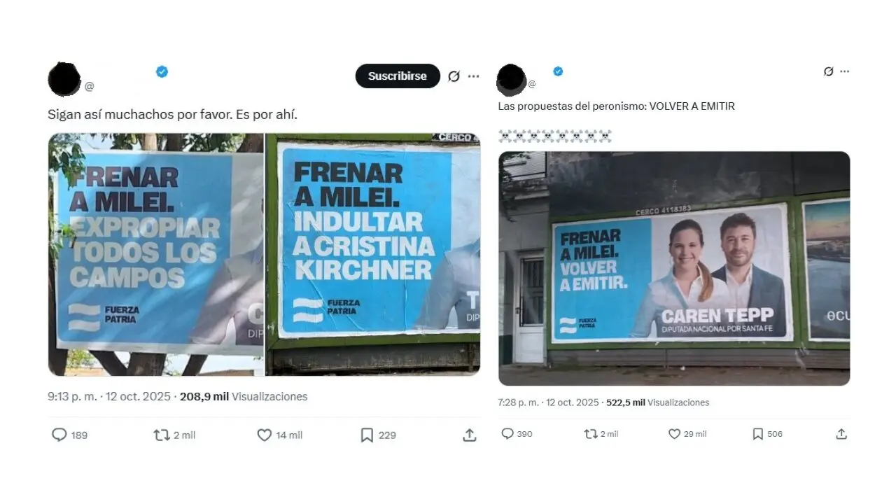 “Frenar a Milei. Indultar a Cristina Kirchner”; “Frenar a Milei. Volver a emitir”; “Frenar a Milei. Expropiar todos los campos”, se lee en las imágenes de supuestos carteles políticos en la vía pública de la primera candidata a diputada por Fuerza Patria en Santa Fe, Caren Tepp, según posteos compartidos en X (ver aquí, aquí, aquí y aquí).