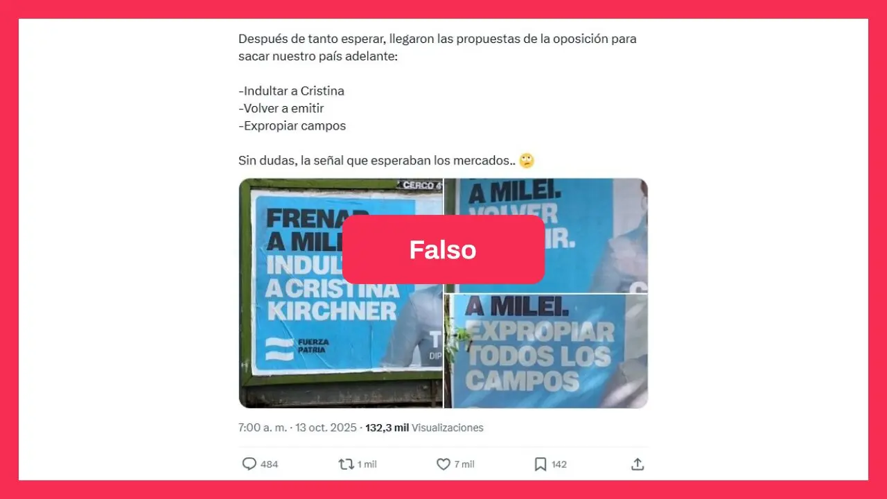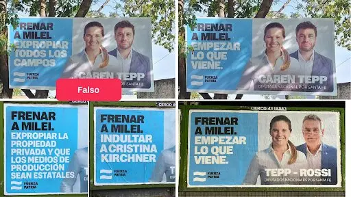 “Frenar a Milei. Indultar a Cristina Kirchner”; “Frenar a Milei. Volver a emitir”; “Frenar a Milei. Expropiar todos los campos”, se lee en las imágenes de supuestos carteles políticos en la vía pública de la primera candidata a diputada por Fuerza Patria en Santa Fe, Caren Tepp, según posteos compartidos en X (ver aquí, aquí, aquí y aquí).