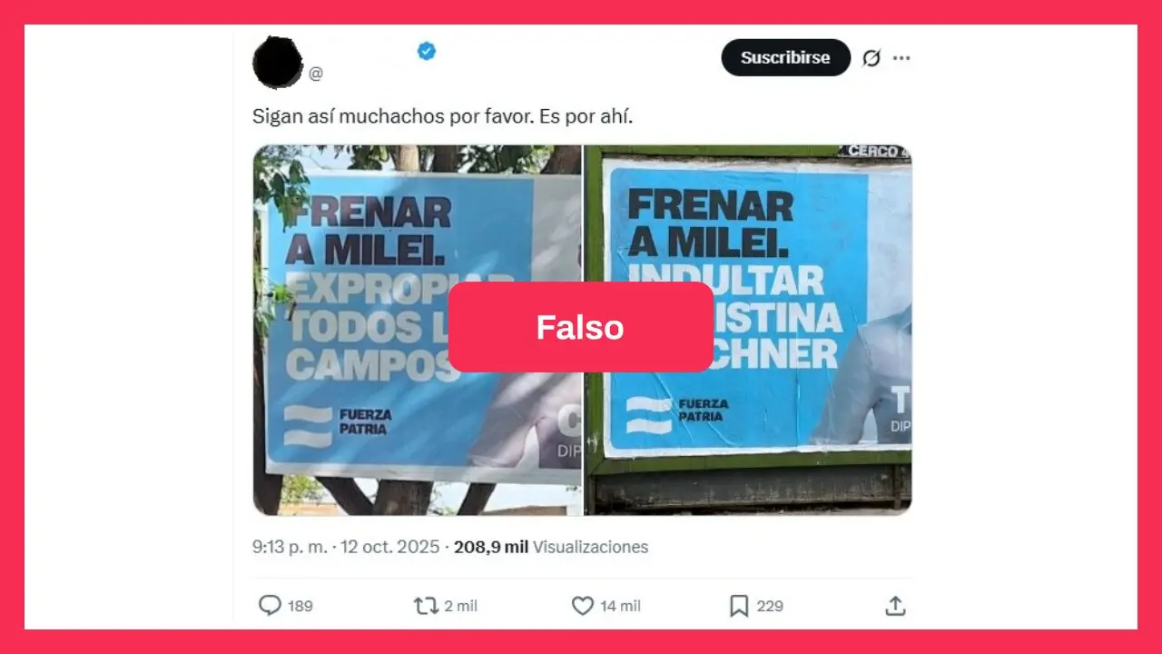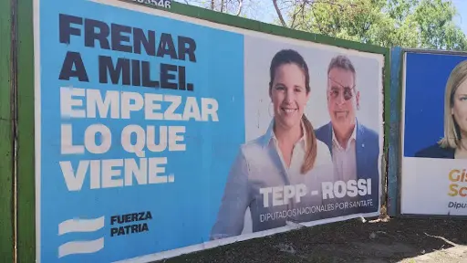 - Pero las imágenes viralizadas en redes sociales son fotomontajes. Se alteraron los textos de la cartelería política que Fuerza Patria colocó en las calles de Santa Fe para las elecciones nacionales del 26 de octubre de 2025.