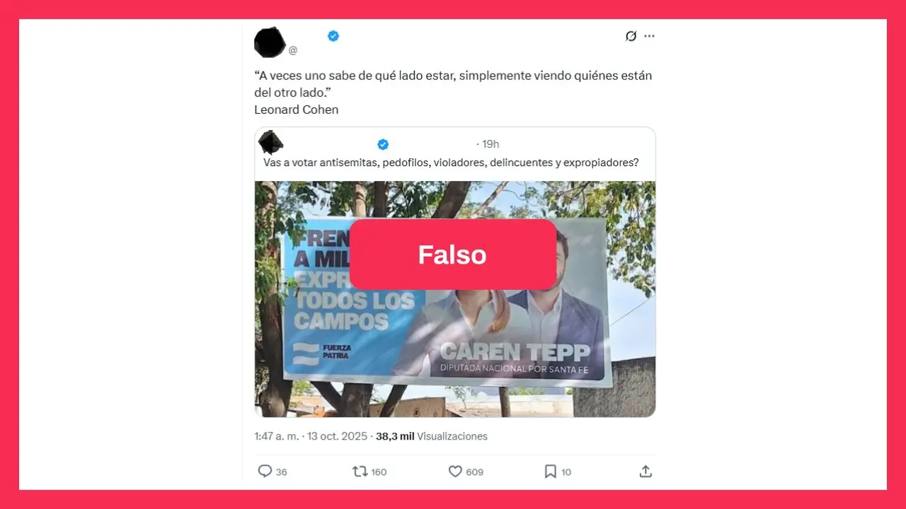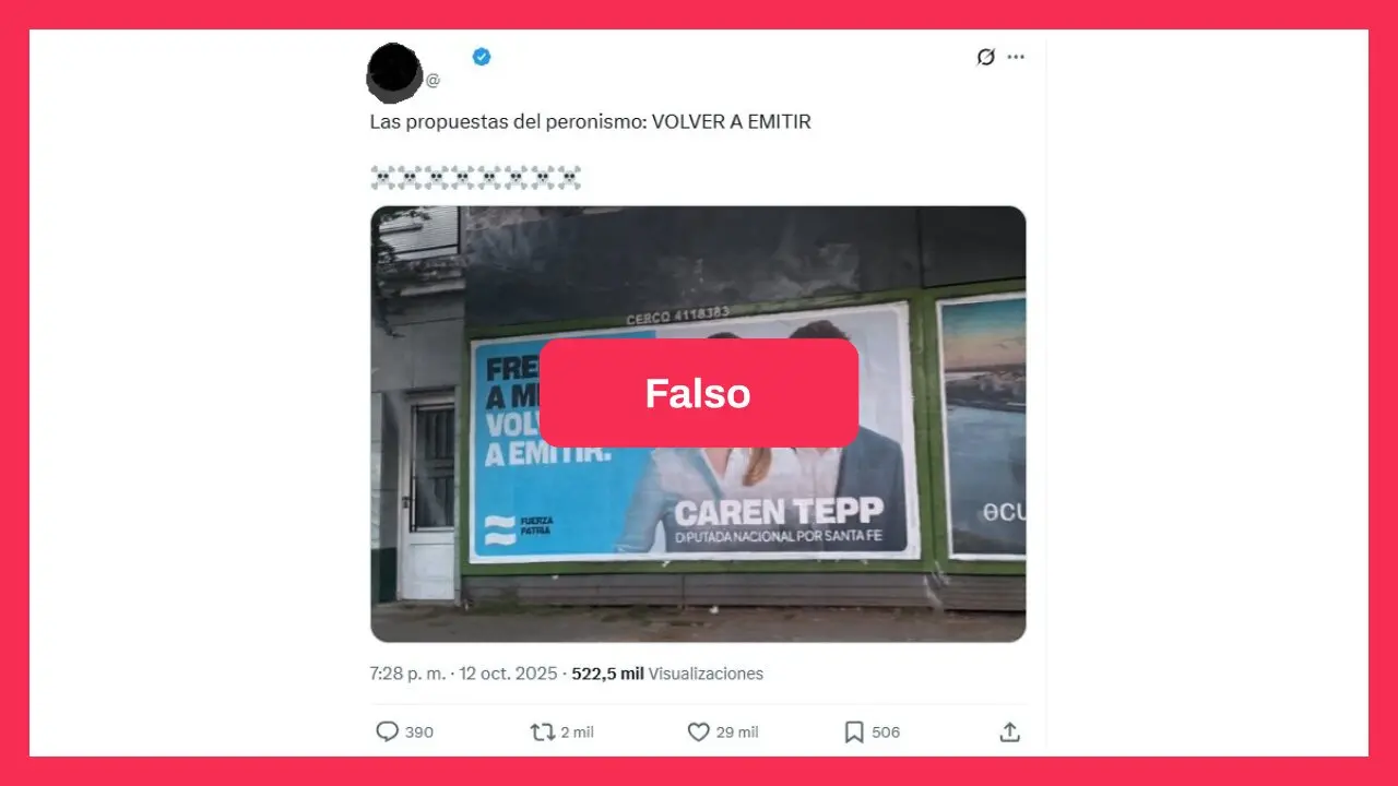 - En redes sociales circulan supuestas fotos de carteles de la candidata a diputada de Fuerza Patria por la provincia de Santa Fe, Caren Tepp, con la frase “Frenar a Milei”, acompañada de propuestas como “Indultar a Cristina Kirchner”, “Volver a emitir” y “Expropiar todos los campos”.