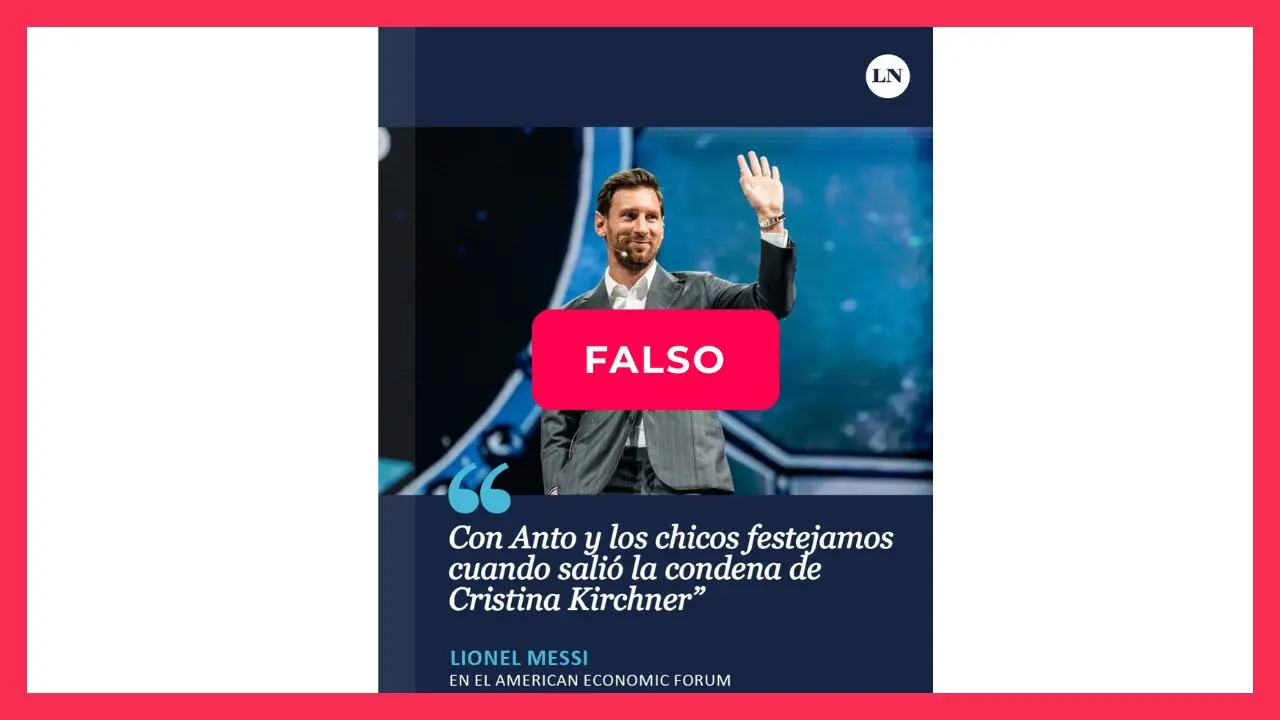 Circula en redes sociales una supuesta placa de La Nación con una foto de Messi en el America Business Forum y una presunta cita sobre la ex presidenta: “Con Anto y los chicos festejamos cuando salió la condena a Cristina Kirchner”. Según la placa, la frase habría sido dicha por el futbolista en el “American Economic Forum”.