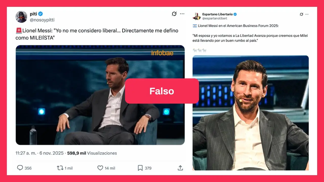 Además, una de las fotos de los posteos -donde Messi supuestamente habría dicho “Yo me defino como liberal, directamente mileista”- corresponde a un recorte publicado por Infobae de la disertación del futbolista argentino en el America Business Forum, en Miami, el último 5 de noviembre. A lo largo de los 5 minutos del video, en ningún momento menciona las palabras “liberal” o “mileista”, ni hace referencia alguna sobre sus preferencias políticas.